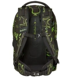 Practical Satch rain cover in solid black with a discreet pattern of triangles, and on the right side, there is a “Satch” brand name in white letters. Down the sides, there are narrow reflective stripes.