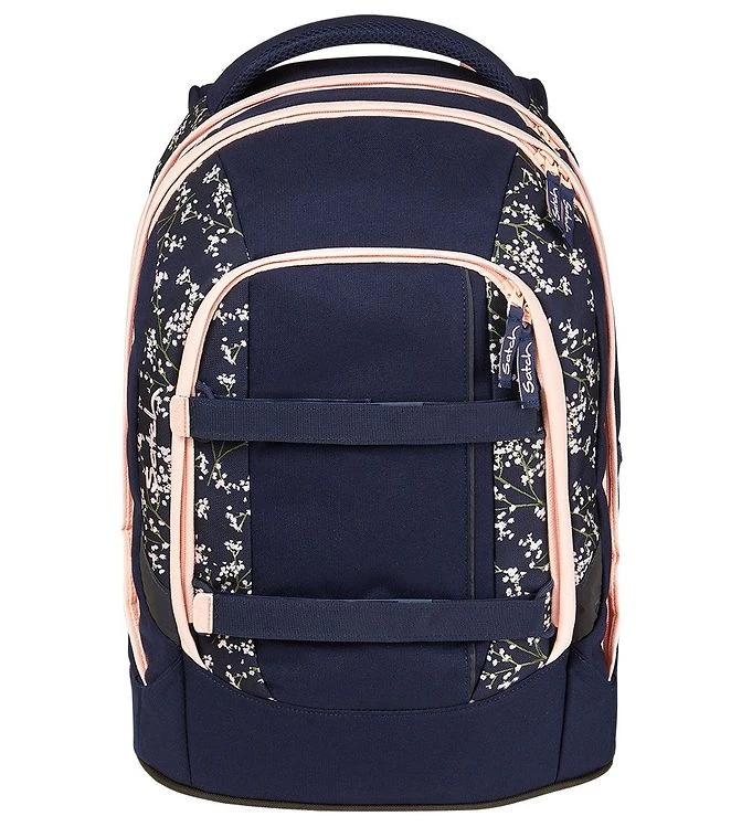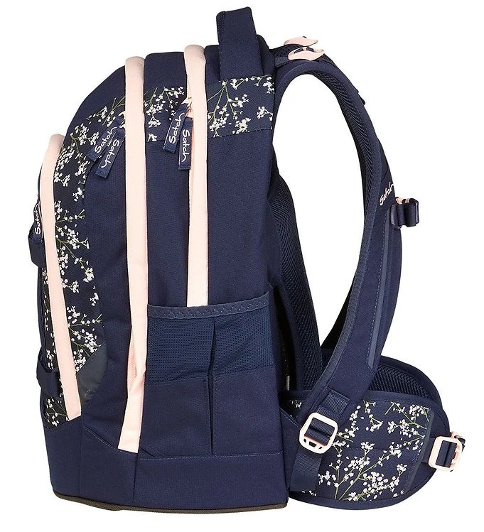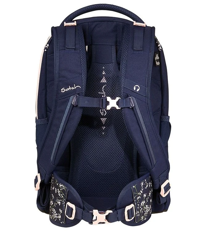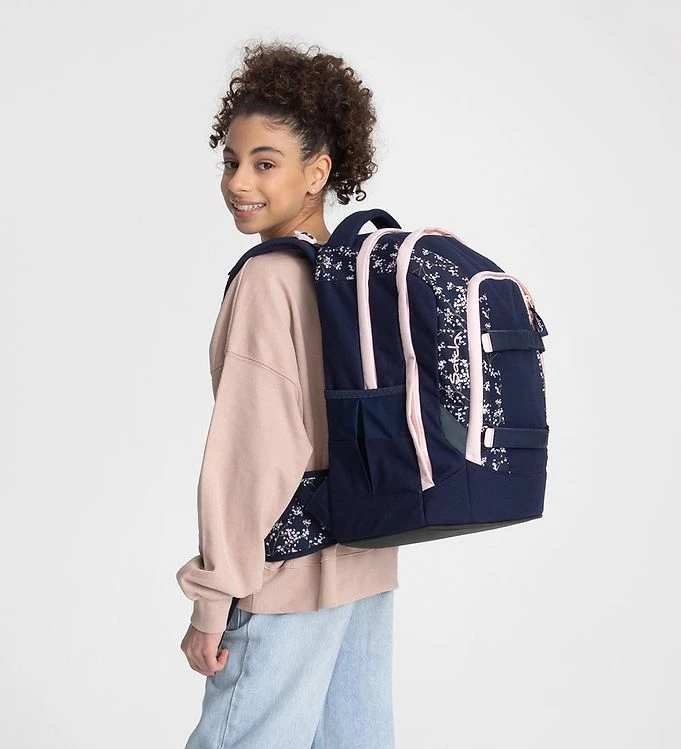 Nice Satch school backpack in navy with a floral print in pink and green on parts of the school backpack and details in pink.