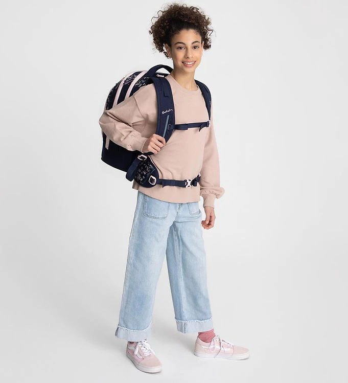 The Satch school backpack has a completely firm bottom and back that provides ergonomic support. The back can also be adjusted to the kid’s height, so that the bag fits perfectly, while the school backpack grows with the kid and can be used for many years. There are padded shoulder straps that can be adjusted in length, and they can also be adjusted according to how high up on the back of the bag they should sit. In addition, there is an adjustable chest buckle and a hip belt, which can be removed if desired.
