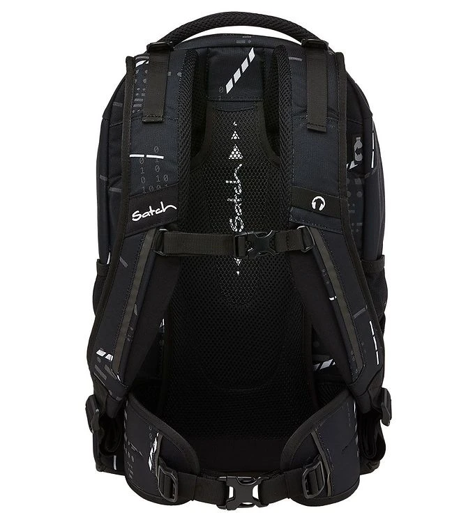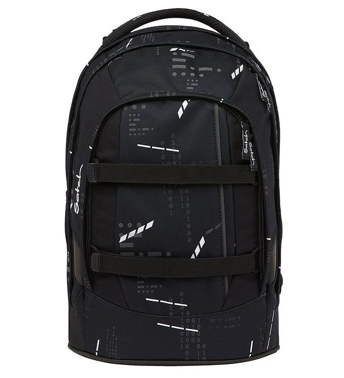 Nice Satch school backpack in black with a print of different shapes and numbers in white and grey. The numbers light up if there is a bright light on them, as if from a flashlight.