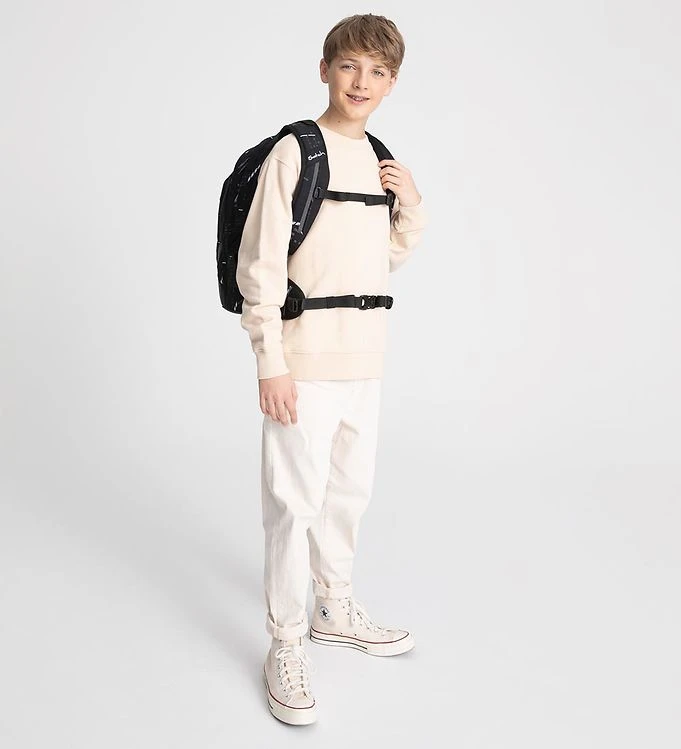 In the sides of the school backpack there are practical mesh pockets with elastic edge, and at the front there are two adjustable straps with velcro, so you can fasten a jacket, a bicycle helmet, a ball or similar. These straps can also be changed to others colours, so you can create your very own stamp on the bag.